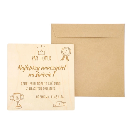 Prezent dla nauczyciela - drewniana kartka z życzeniami