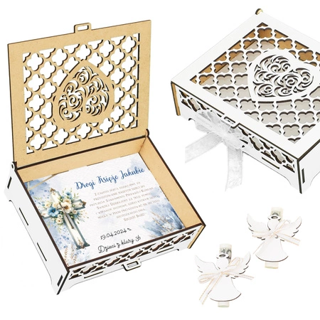✔️ Drewniane wykonanie, ażur na froncie pudełka - odbiorca otrzymuje trwałą pamiątkę, która z czasem nie traci na wartości.