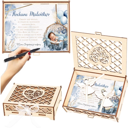 ⭐Oryginalny upominek z okazji chrztu dla chłopczyka - drewniane pudełko na pieniądze z życzeniami i miejscem na własnoręczny podpis!
