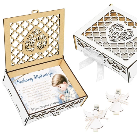 Pudełko świetnie sprawdzi się jako podarunek z okazji Pierwszej Komunii Świętej. Ten upominek będzie zarówno praktyczny, jak i symboliczny oraz podkreśli znaczenie tej uroczystości.