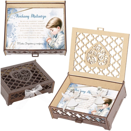 ✔️ Drewniane wykonanie, ażur na froncie pudełka - odbiorca otrzymuje trwałą pamiątkę, która z czasem nie traci na wartości.