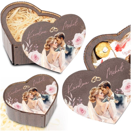 ⭐Oryginalny upominek na ślub w kształcie serca - drewniane pudełko z nadrukiem i wełną drzewną!