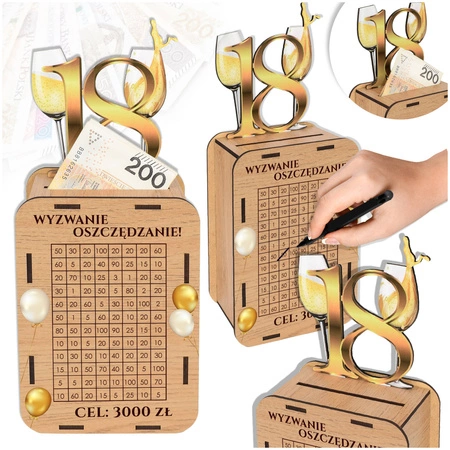 Stylowa drewniana skarbonka, wykonana z najwyższej jakości materiałów, to nie tylko praktyczny sposób na oszczędzanie, ale także wyjątkowy prezent na 18-naste urodziny. Dzięki możliwości wykreślania oszczędności, każdy krok w stronę celu staje się motywującą przyjemnością!