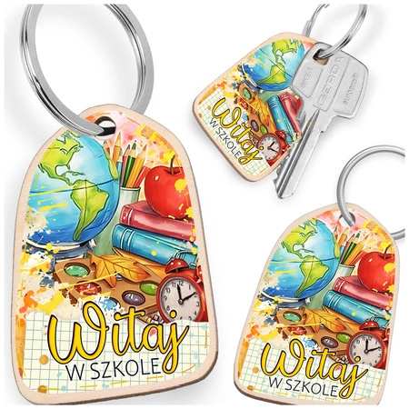 - Drewniany brelok z kolorowym nadrukiem – idealna pamiątka pasowania i rozpoczęcia roku szkolnego.
