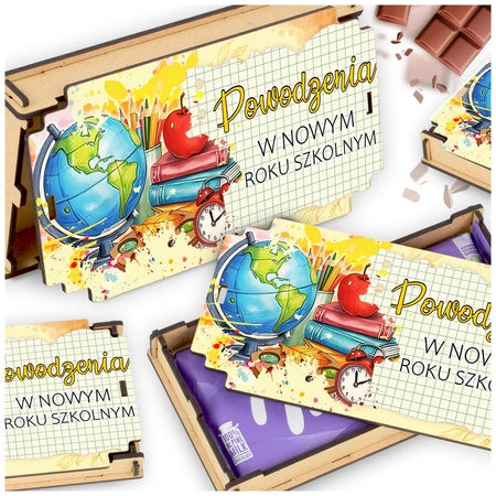 - Drewniane upominek z kolorową grafiką — praktyczna pudełko na czekoladę pamiątka pasowania i rozpoczęcia roku szkolnego.