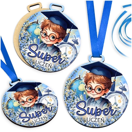 - Drewniany medal z kolorowym nadrukiem i niebieską wstążką – pamiątka pasowania i rozpoczęcia roku szkolnego.