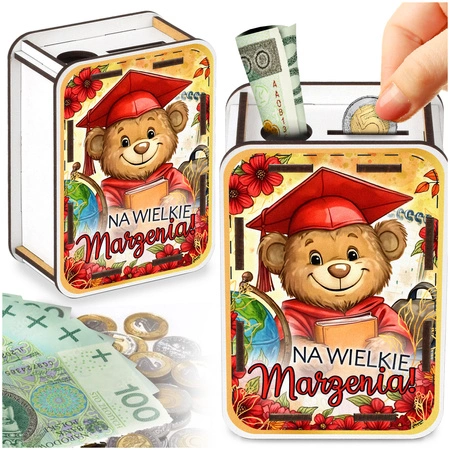 Skarbonka drewniana z nadrukiem – pasowanie i szkoła