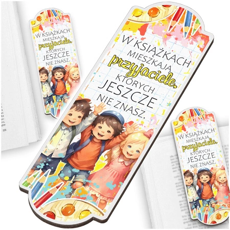 - Zakładka z nadrukiem – praktyczny upominek na pasowanie do szkoły i przedszkola, trwała i lekka.