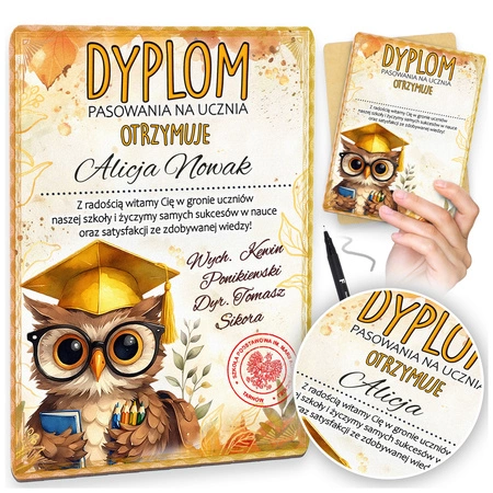 - Drewniany dyplom pasowania z kolorowym nadrukiem — pamiątka rozpoczęcia szkoły, gotowa do własnoręcznego uzupełnienia.