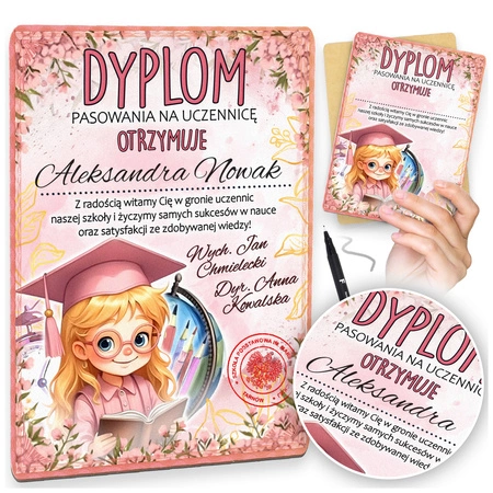 - Trwały drewniany dyplom z barwną grafiką – pamiątka pasowania na ucznia lub rozpoczęcia roku szkolnego.