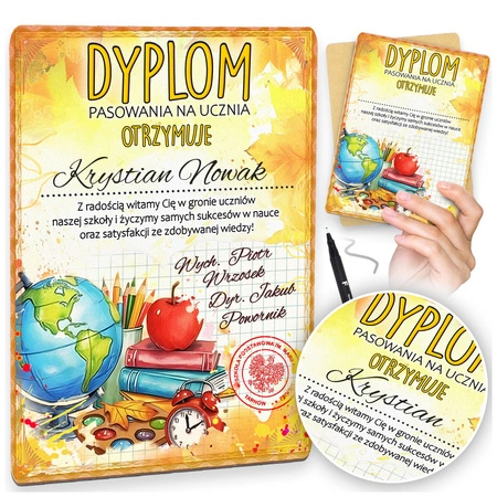 - Pamiątka pasowania i początku szkoły/przedszkola – drewniany dyplom z kolorowym nadrukiem i miejscem na podpisy.