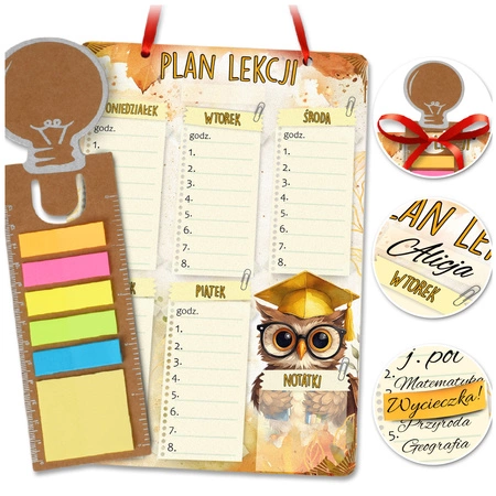 Wyjątkowa tabliczka z planem lekcji wykonana z solidnej drewnianej płyty. Połączenie naturalnego materiału z barwną grafiką sprawia, że to jednocześnie praktyczny organizer i estetyczna pamiątka pasowania na ucznia lub rozpoczęcia roku szkolnego. W zestawie znajduje się zakładka w kształcie żarówki z nadrukowaną linijką oraz kolorowe karteczki samoprzylepne, które ułatwiają szybkie notatki i modyfikacje planu.