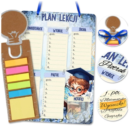 - plan lekcji, zakładka z linijką i karteczkami, wstążka, magnes