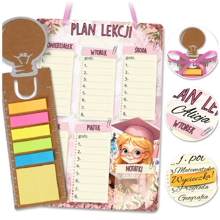 - plan lekcji, zakładka z linijką, karteczki samoprzylepne, magnes, wstążka