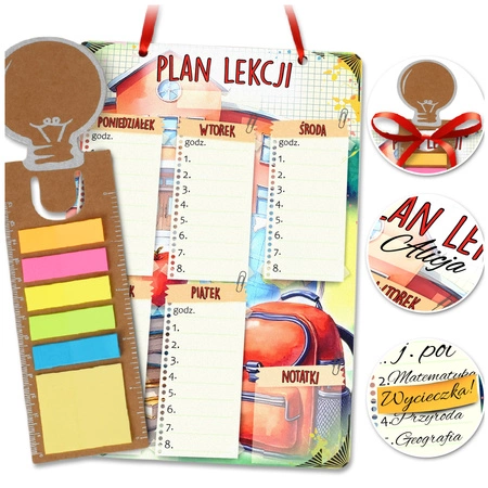 - plan lekcji, zakładka z linijką i karteczkami, wstążka, magnes