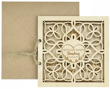 Drewniana, trawała i ekologiczna kartka pamiątkowa na uroczystość Komunii Świętej.