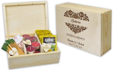 Piękne pudełko-niezbędnik z grawerem, wypełnione wiórkami drzewnymi to doskonały pomysł na wyjątkowy prezent dla dziadków.