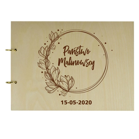 Album z drewnianą, spersonalizowaną okładką oraz miejscem na życzenia i podpis stanowi ciekawą alternatywę dla kwiatów i butelki wina!