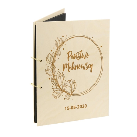 Album z drewnianą, spersonalizowaną okładką oraz miejscem na życzenia i podpis stanowi ciekawą alternatywę dla kwiatów i butelki wina!