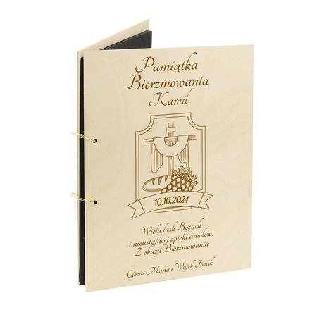 Pięknie grawerowana okładka z nietypowego materiału wyróżnia album na tle tradycyjnych propozycji. Naturalny charakter drewna pasuje do każdego wnętrza, dzięki czemu oprócz sentymentalnej pamiątki stanowi element dekoracyjny.