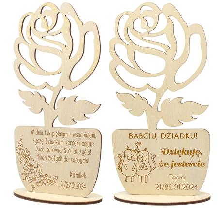 Drewniany kwiatek z grawerem to niebanalny prezent, który codziennie będzie przywoływał miłe wspomnienia u obdarowanych dziadków.