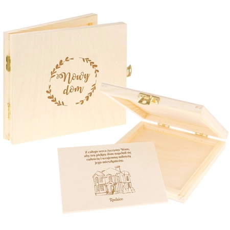 Wybierasz się do znajomych, którzy właśnie ukończyli budowę domu/wprowadzili się do nowego mieszkania i szukasz drobnego, aczkolwiek wyjątkowego prezentu? Drewniana kartka w gustownej szkatułce będzie strzałem w 10tkę! Do kartki można dołożyć gotówkę - wówczas prezent w postaci pieniędzy ma dodatkową wartość dodaną, a sama kartka stanowi wyjątkową pamiątkę przywołującą wspomnienia z tej wizyty.