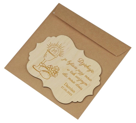 Drewniane, grawerowane podziękowania dla Gości z okazji udziału w Komunii Świętej.
