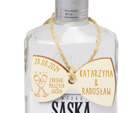 Zawieszki na wódkę weselną w kształcie muszki będą pięknie prezentować się na alkoholu, a treść, którą zawierają dodatkowo zaciekawi gości.