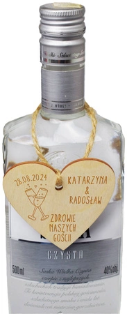 Zawieszki na wódkę weselną w kształcie serca będą pięknie prezentować się na alkoholu, a treść na nich zawarta dodatkowo zaciekawi gości.