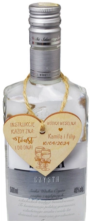 Zawieszki na wódkę weselną w kształcie serca będą pięknie prezentować się na alkoholu, a treść na nich zawarta dodatkowo zaciekawi gości.